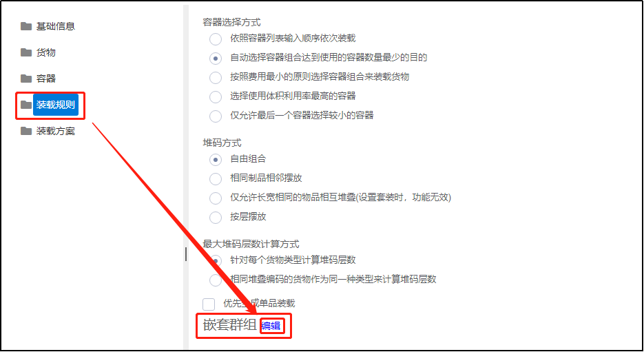 嵌套群组设置时,上图中的群组从上到下,装载条件是从宽松到严格,从这一层群组到上一层群组间的货物混装时的划分标准就是【当前群组可接受的最小装载率】这一参数。