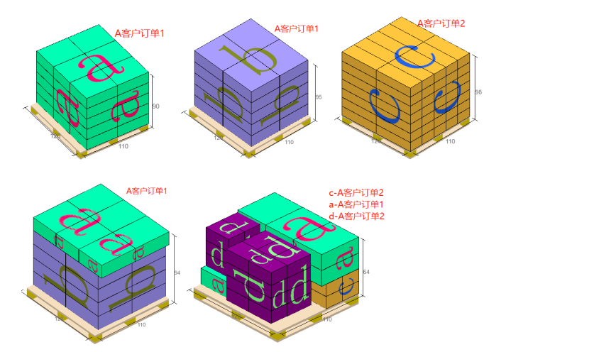 同一批次的货物,分为不同客户,而同一客户下又有不同的订单,同一订单中又含多种物料。当计算它们如何装柜(打托、装箱)时,要求不同客户的不能混装;同一个客户的同一订单尽量少分装;且一个订单中同一物料的货物尽量少分装,但若存在尾数箱,则优先和同一订单的其他物料混装;同一订单的货物的尾数优先与同一客户的其他订单混装,循环往复,依此类推。